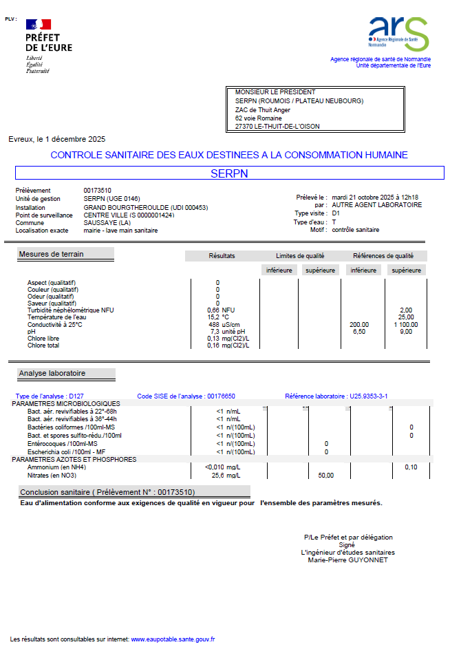 Contrôle sanitaire des eaux destinées à la consommation humaine.